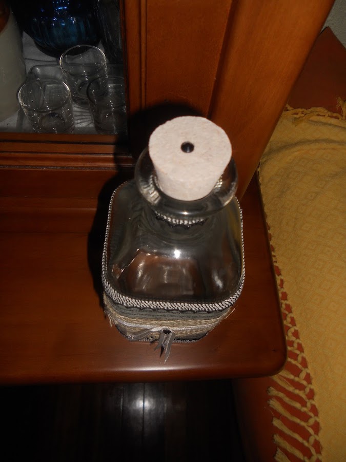 recorté un trozo de tela de arpillería, pegué con silicona, puse alrededor puntilla adhesiva y detalle de una llave adhsesiva pegada con silicona.
