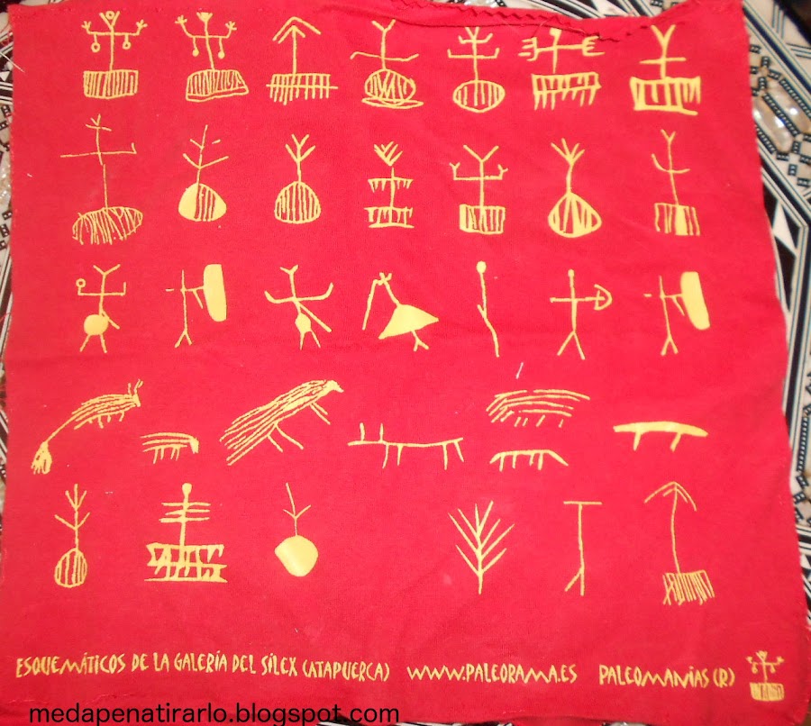 Otro top que se me quedó pequeño y he recortado el frontal. Contiene dibujos reales encontrados en la galería del sílex de Atapuerca y me parecen muy graciosos. Si alguien busca trazos sencillos para bordar o dibujar con rotuladores textiles, aquí tiene ideas basadas en pictogramas reales. Así que si quereis aprovechar los de la foto como inspiración...adelante.