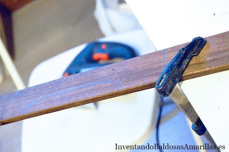 Otra cosa: siempre, siempre… hay que fijar bien la pieza que vamos a cortar. Si está bien fija, la vibración baja mucho. Para nuestro cajón hemos decidio hacer un corte en uno de los listones de los laterales y crear un asa. Hacemos el dibujo con lápiz, anclamos el listón y empezamos a cortar. Para terminar de darle la forma que buscamos usamos la lijadora.