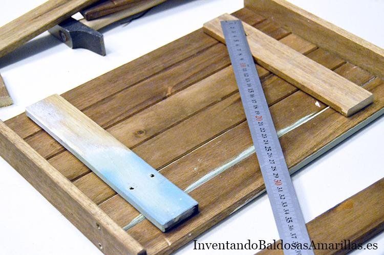 Vamos a hacer dos pisos. Es decir, dos tablillas por cada lado. En una de las fotos anteriores podéis ver cómo queda si ponemos sólo un listón. Os lo dejamos como idea por si os apetece montar una bandeja. Si lo que queréis es darle más altura, clavamos los listones a los cantos de nuestra base. Luego, colocamos esas piezas en las esquinas, a las que vamos a clavar el segundo piso de listones.