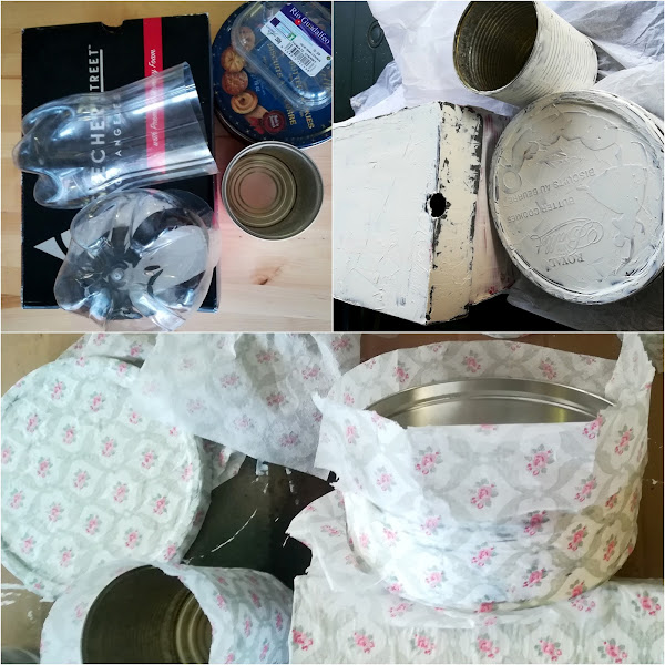 Lo que he hecho primero es forrar las cajas y lata de tomate con gesso para tapar toda la publicidad de manera rápida y una vez seco, ya he cogido las servilletas, he separado las 3 capas que llevan quedándome con la estampada y con gel medium le he dado al decoupage (algunos me han salido mejor que otros, no me lo tengas en cuenta).