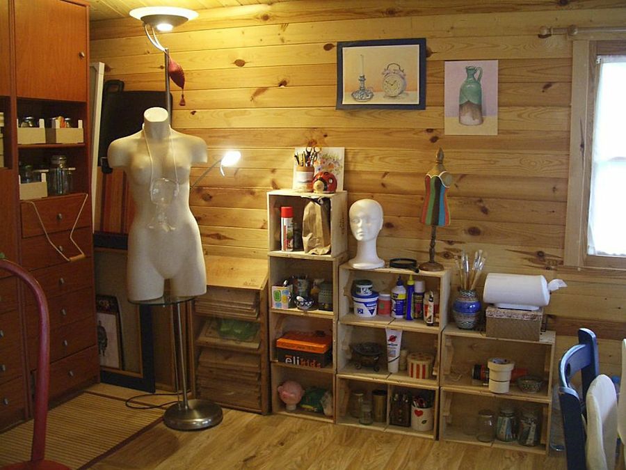 En el acogedor taller de Monane, las cajas de vino han servido para ensamblar unas estanterías muy prácticas.