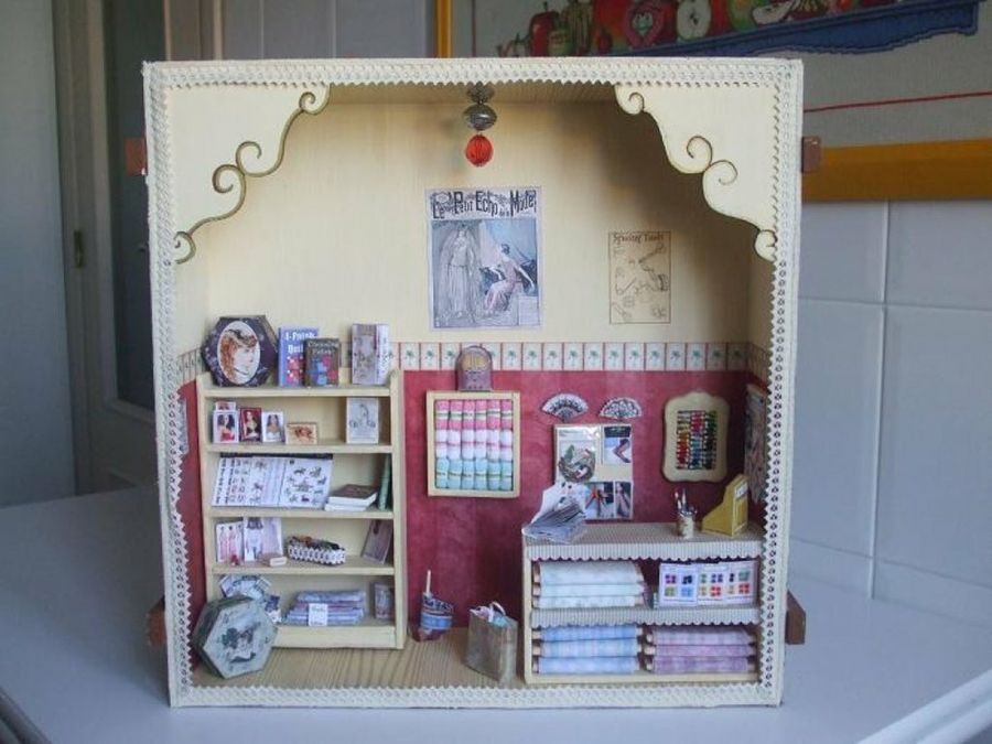 Begomat nos enseña un cautivador rincón en miniatura, completamente realizado por ella. La caja sirve como inmejorable escenario para una mercería de cuento.