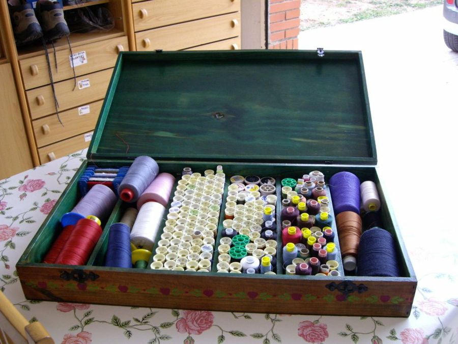 Ninapakari es una apasionada de las cajas de vino, y las usa en infinidad de diseños. La que vemos en la foto, menos honda de lo habitual, se presta muy bien como clasificador de bobinas.