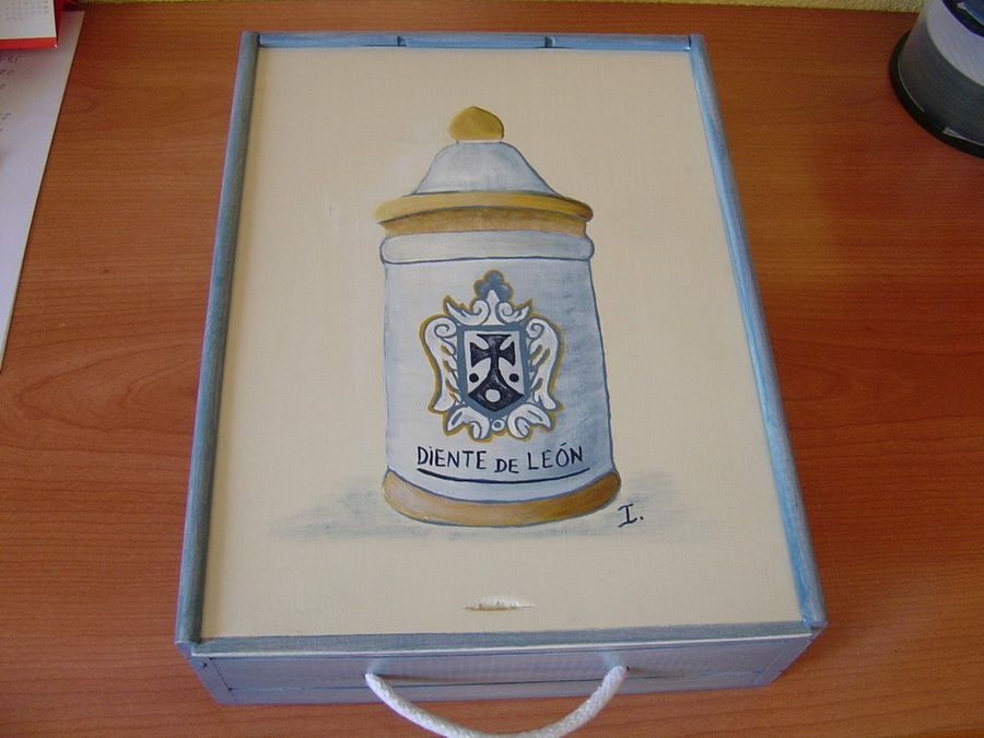Esta atractiva pieza es el botiquín de Isbel10. Nuestra lectora ha pintado en la tapa un recipiente clásico como los que se usaban en las farmacias antiguas para guardar los productos.