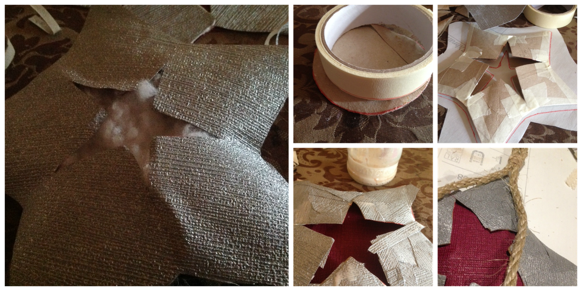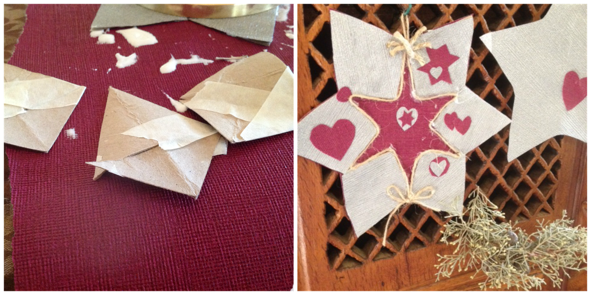 Para ello, aplastamos 5 rollitos de papel higiénico y dibujamos un rombo ,y los cortamos.Se unen con cinta de carrocero en forma de estrella.