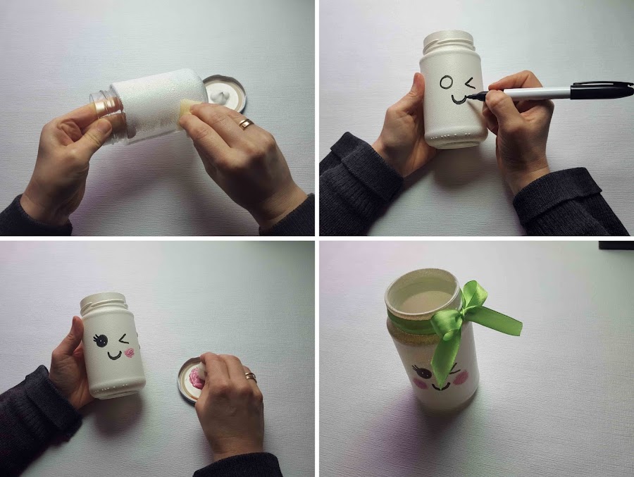 Se pinta el tarro y se deja secar. Se pintan los ojos y la boca y por último los coloretes.