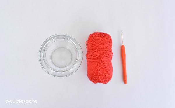 Los materiales son muy sencillos, un bote de conservas de cristal, un poco de algodón (el mío es Safran de Drops Rojo 19) y un ganchillo del 3.