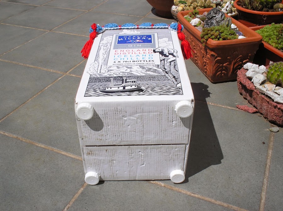 simplemente le pegué con cola 4 tapones a modo de patas, hice un remate a ganchillo que simplemente está sujetado en las esquinas con unos clips y listo!!!!!!!!!