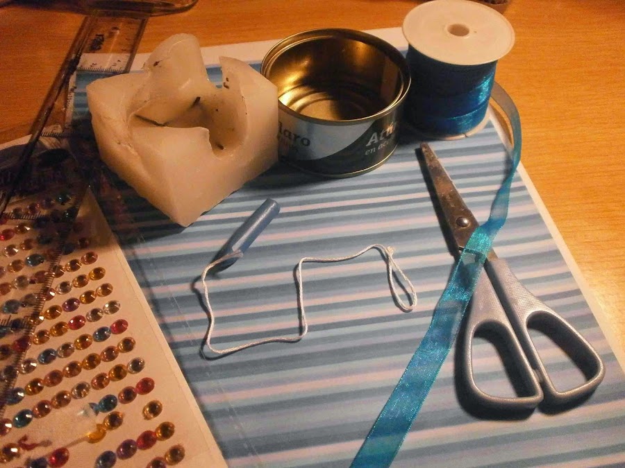 Materiales principales: vela gastada, una lata, un lazo, regla, tijeras, papel pintado, hilo de algodón, un trozo de cera stiker, un cazo viejo, silicona y un palillo.