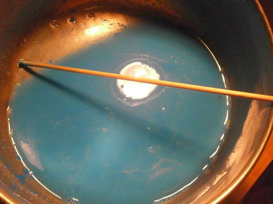 Ponemos al fuego un cazo viejo y le añadimos la vela rayada y el trozo de cera de color. Si queremos que la vela sea perfumada le pondremos unas tres o cuatro gotas de esencia de aromas.