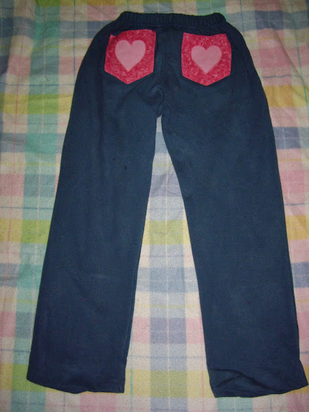Elegi las telas para poder llevar a delante mi proyecto...Era necesario tapar de alguna forma ese agujero de la rodilla, para ello aplique unos parches ovalados de color rosa, usando la misma tecnica que cuando recicle las sudaderas/buzos, y los cosi a mano, para no tener que descoser la pierna del pantalon. Terminado esto, mi hija me pidio que le hiciera unos bolsillos atras con corazones y dos corazones en el frente. Asi que cumpliendo los deseos de la princesa, aqui pueden ver mi trabajo terminado: