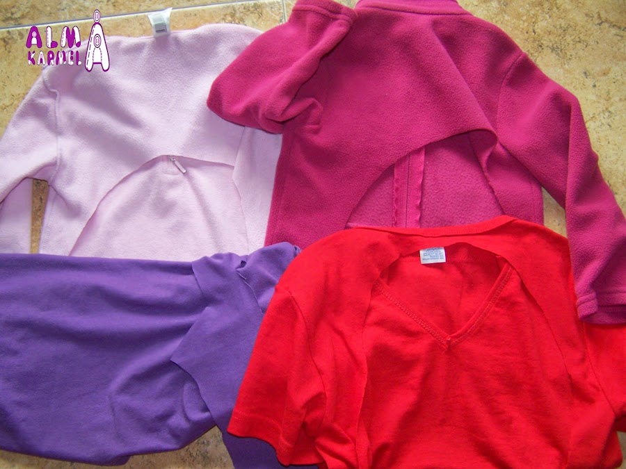 Y aquí veis de dónde lo he sacado, de unos forros polares que ya se habían quedado pequeños (el azul falta en la foto) y de un par de camisetas de propaganda que no usaba. El forro polar azul, era del papi, por lo que las dos piezas del gorro me han salido de él, pero los otros como eran de la niña, solo me salía una pieza de cada uno, por eso los dos colores