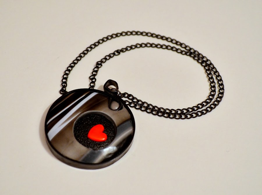 Esta vez no quise mezclar tanto los colores para que quedara este efecto tan bonito de rayas más marcadas, y además le añadí varios detalles: textura en el fondo, que se puede ver a través de un círculo más pequeño situado a un lado, estructura de alambre plano negro, cadena negra en lugar de cola de ratón y un pequeño corazón en rojo que le da un toque mucho más alegre. Y todo con un poquito de brillo satinado gracias de nuevo a la cera de suelo.