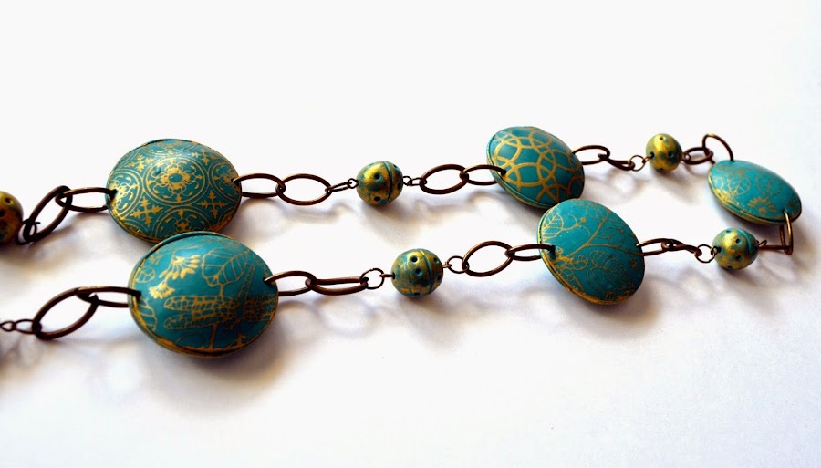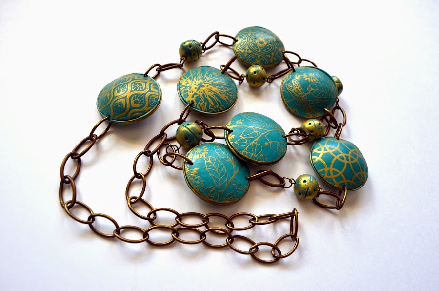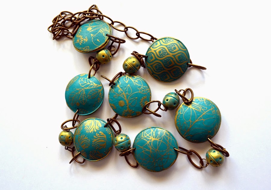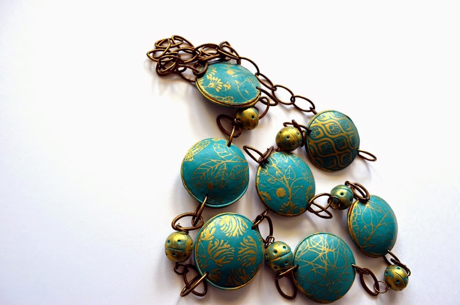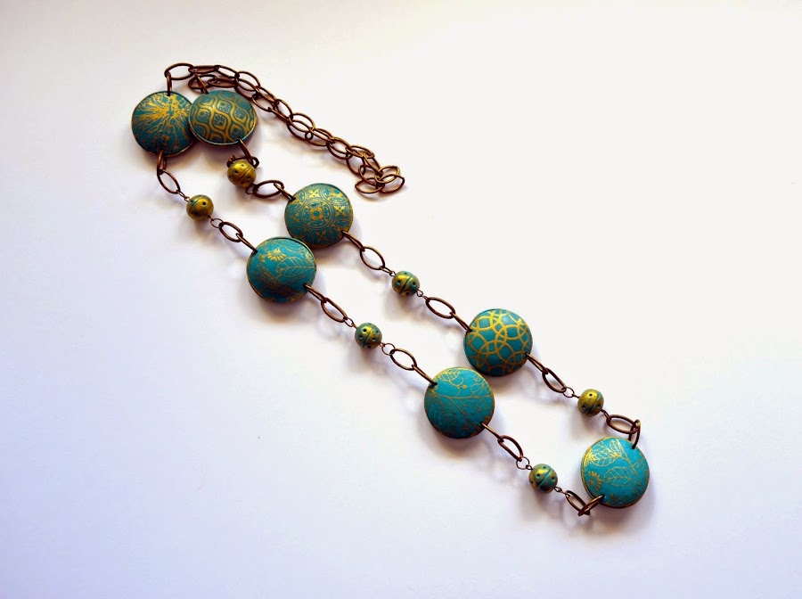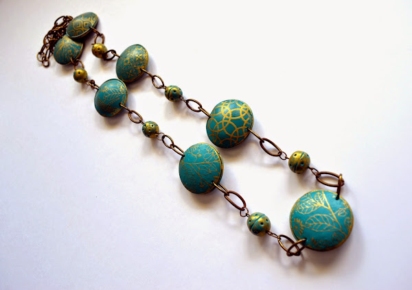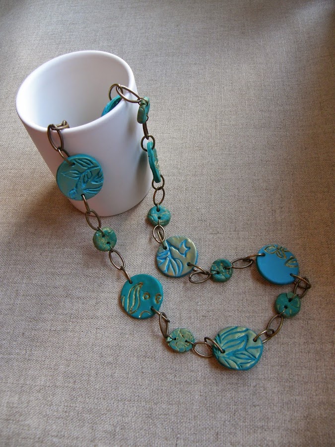 La pieza que he reconstruido es este collar, realizado en arcilla turquesa, con textura y pintura acrílica dorada: