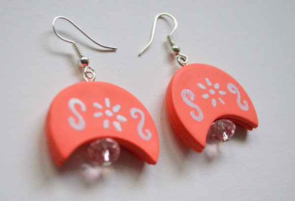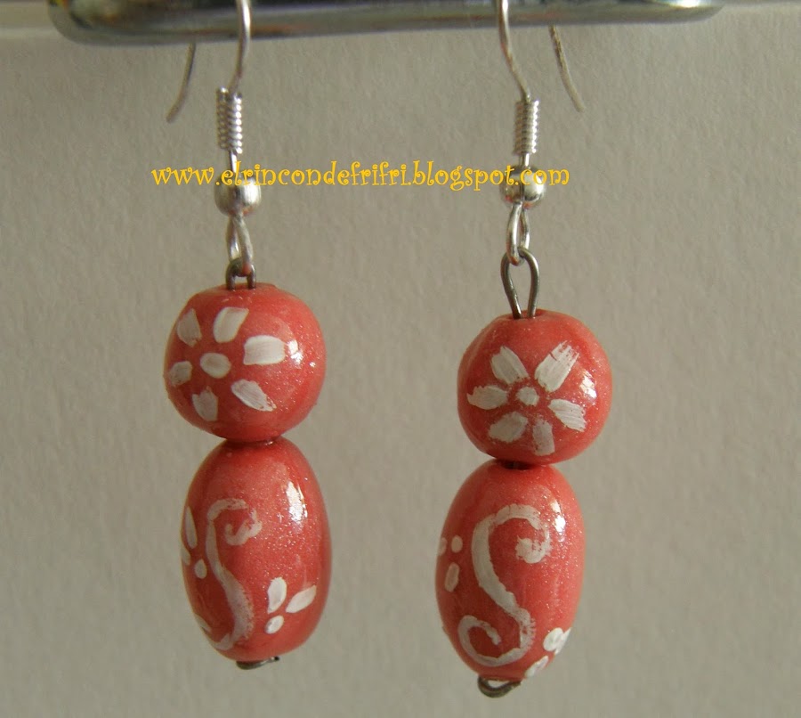 La reconstrucción de hoy corresponde nuevamente a unos pendientes. Los originales son también del 2009, cuando estaba empezando a trabajar la arcilla polimérica, y todavía no contaba con los materiales ni las fornituras suficientes, así que me las arreglaba como podía. De hecho, en lugar de usar un alfiler de bisutería, las cuentas están unidas con alambre de ferretería. Además, los pendientes están barnizados con barniz cerámico, que es un barniz al alcohol, por lo que cuando los tenía puestos y me ponía perfume, que contiene alcohol, el barniz quedaba eternamente pegajoso. En fin, un desastre.