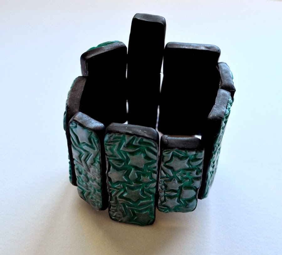 La idea no era mala, pero la ejecución deja mucho que desear, ya que el interior y los laterales no están bien acabados y directamente se ve la arcilla que usé, que era una mezcla de varios colores (lo que suelo llamar arcilla sobrante o de desecho). Además, parece ser que es un degradado verde / negro, pero no se notan nada los dos colores, así que esta vez sólo utilicé verde perlado.