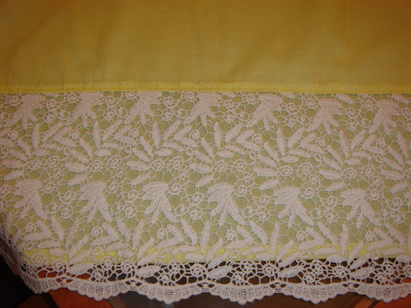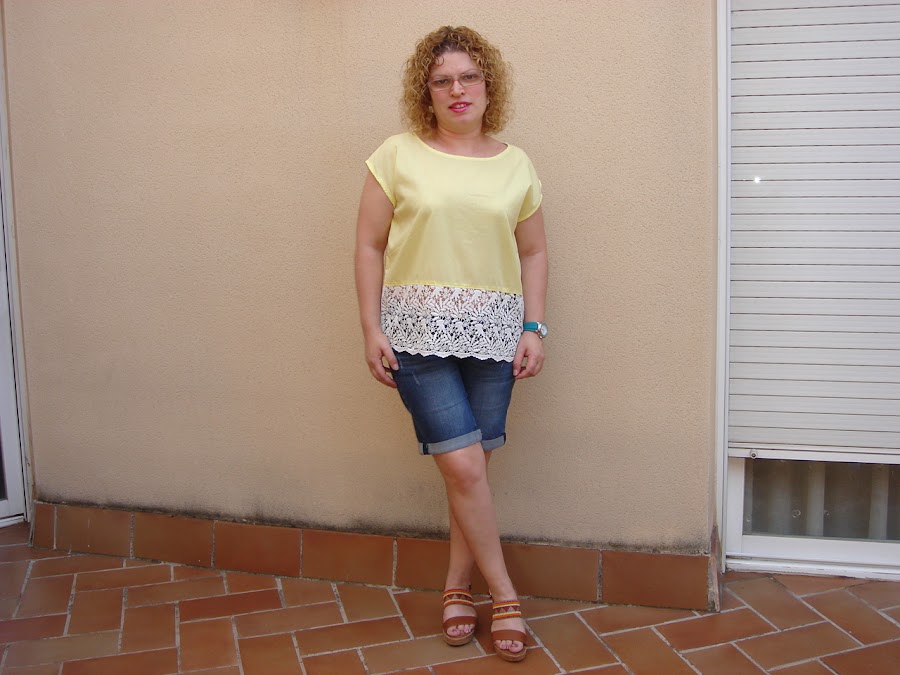 El tercer top que cosi elegi un tejido de lagodon plumeti de color amarillo con aplicacion de guipur en color blanco.