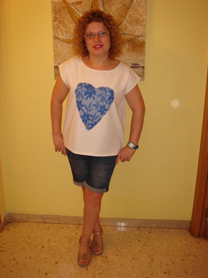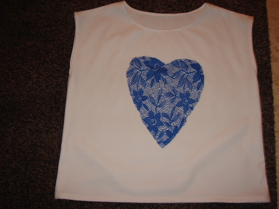El segundo top que cosi experimente con tejido de punto elastico en color blanco y con una aplicacion de guipur en color azul electrico.