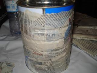 dos capas de mezcla y periódico, en la base del bote y en la tapa sin tocar el cierre.
