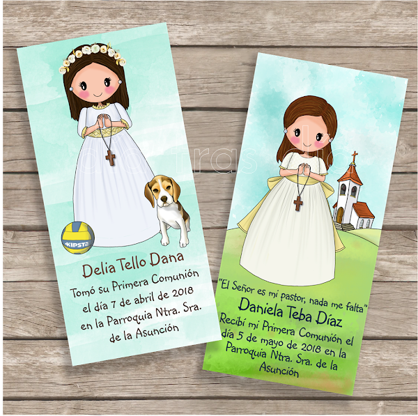 Hace ya varias entradas os enseñé el catálogo que había preparado para las Primeras Comuniones de este año y que podéis recordar aquí. En el apartado de recordatorios os mostraba múltiples opciones de combinacionespara poder crearlos a vuestro gusto, eligiendo entre todas las posibilidades mostradas. Pero también os comentaba allí que si ninguna de estas opciones os gustan, siempre se podía ir a dibujos personalizados, para que el protagonista se vea reflejado en su recordatorio.