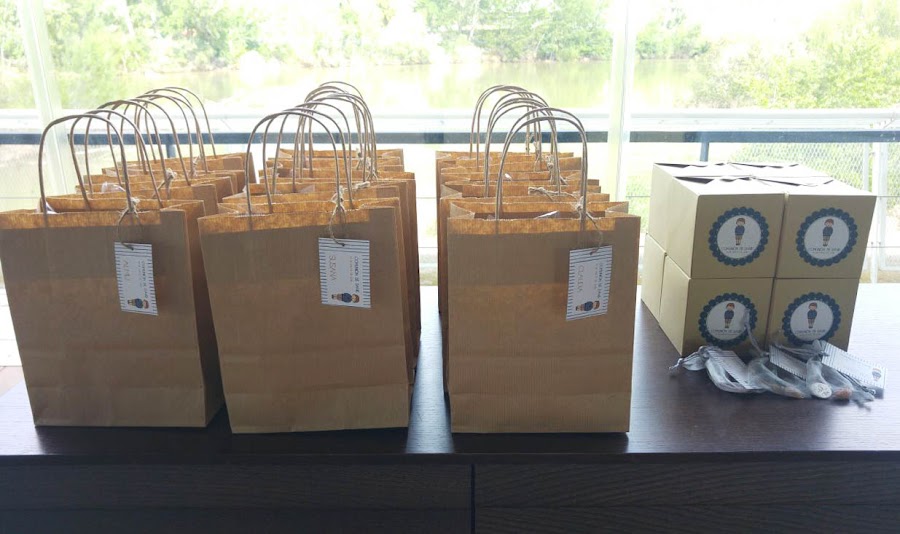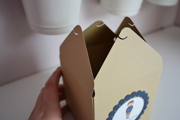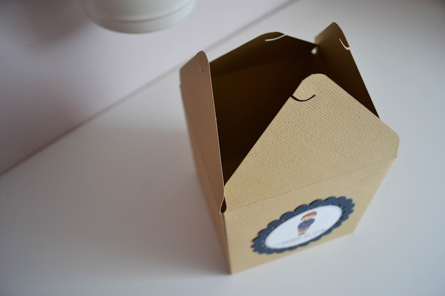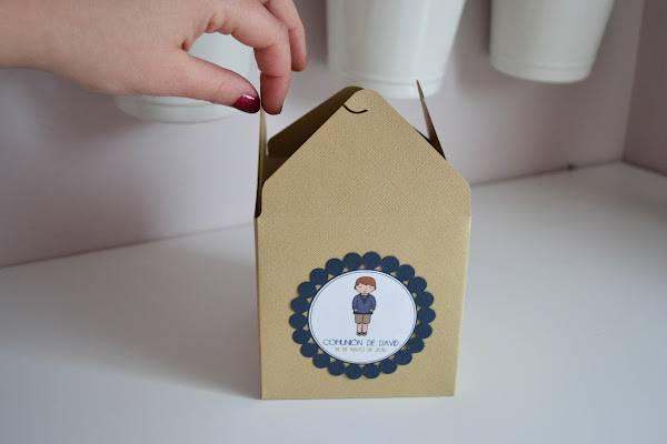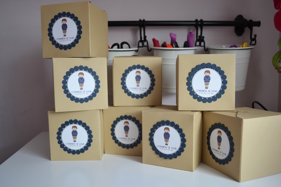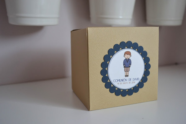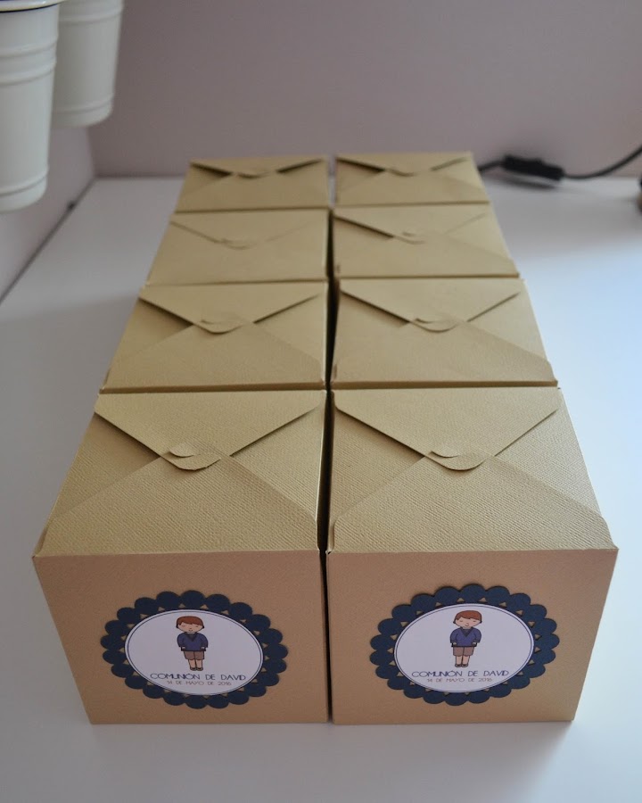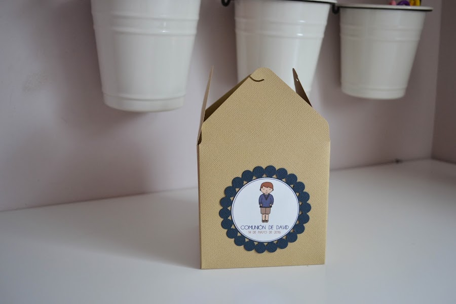 Para los niños realicé unas bonitas cajas de papel para meter las gomis, de color beige decorado con un rosetón azul marino en el centro a juego con el traje de su comunión.