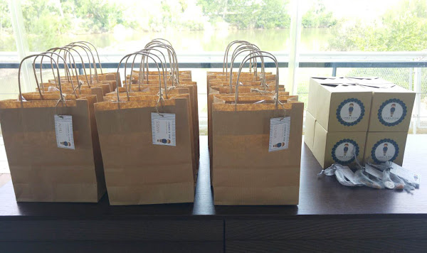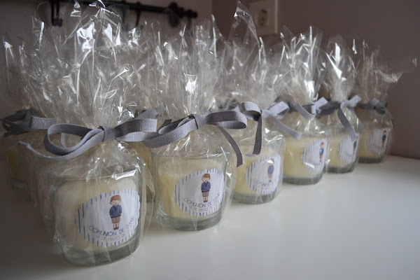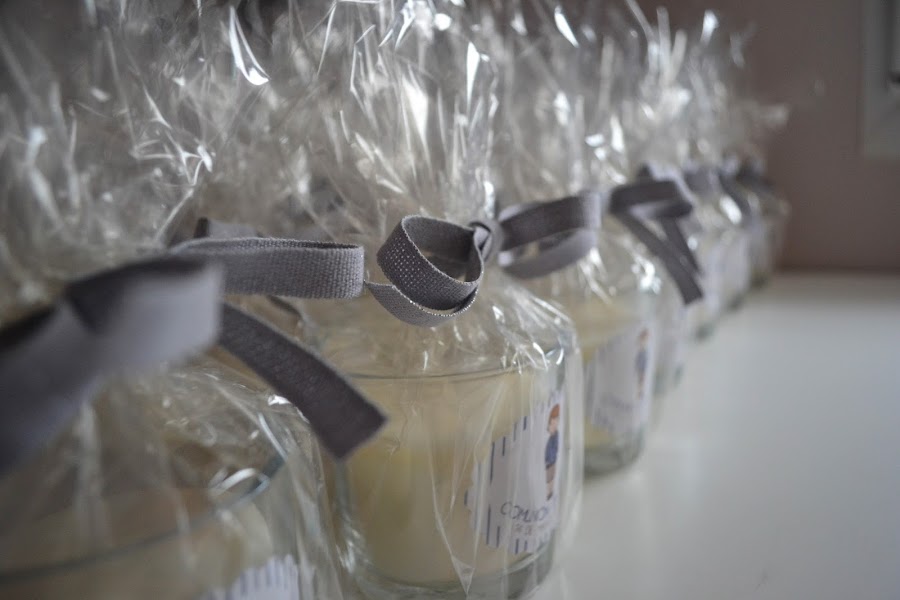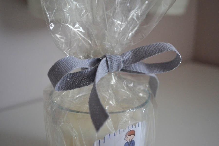 Para los padres, unas velas de vainilla con la misma pegatina que llevaban las cajas y envueltas con papel de celofán y un lacito gris. Estas iban dentro de una bolsita de papel kraft y una etiqueta totalmente personalizada con el nombre del destinatario.