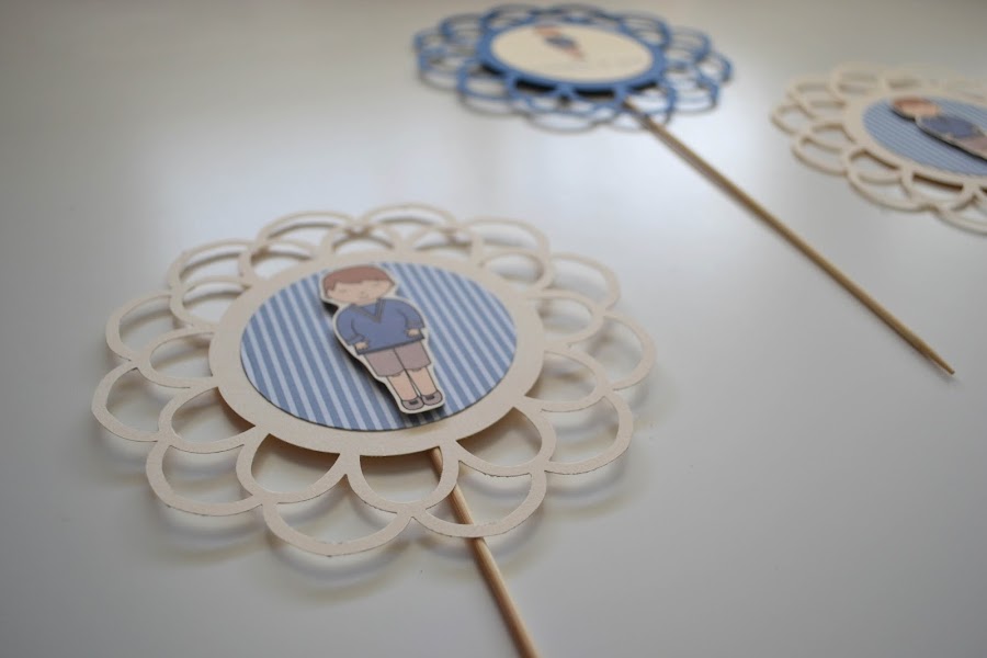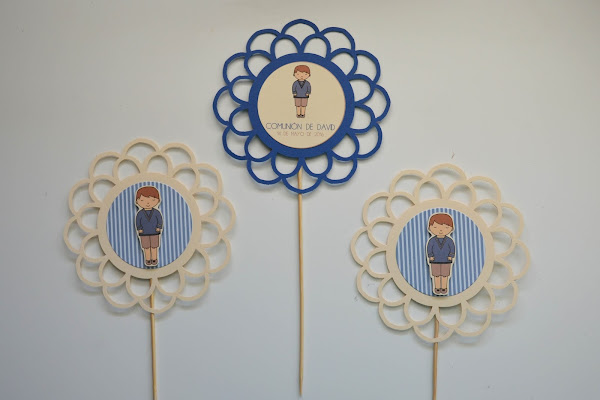 Para la decoración de la mesa de chuches hice tres rosetones de los mismos colores y con la misma pegatina que en el resto de recordatorios y el niño vestido con su traje de comunión.