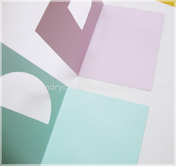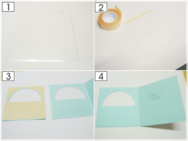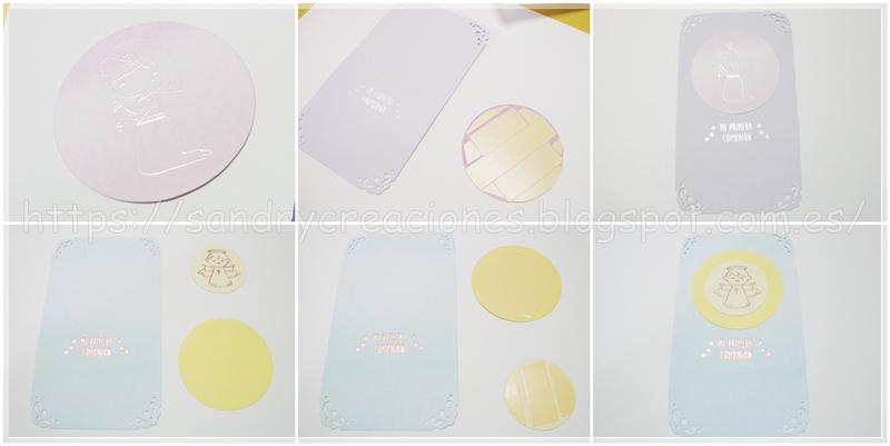 Paso 5. Tras completar todos los diseños con la técnica del embossing terminaremos los recordatorios uniendo las diferentes partes con cinta adhesiva de doble cara y usando las láminas de acetato para poner el "cristal" en las ventanas.