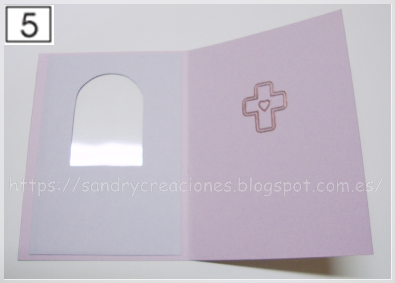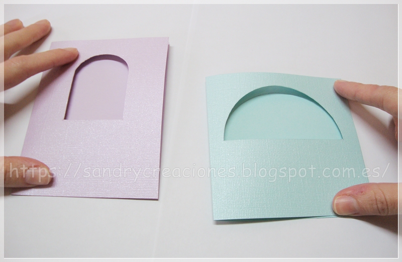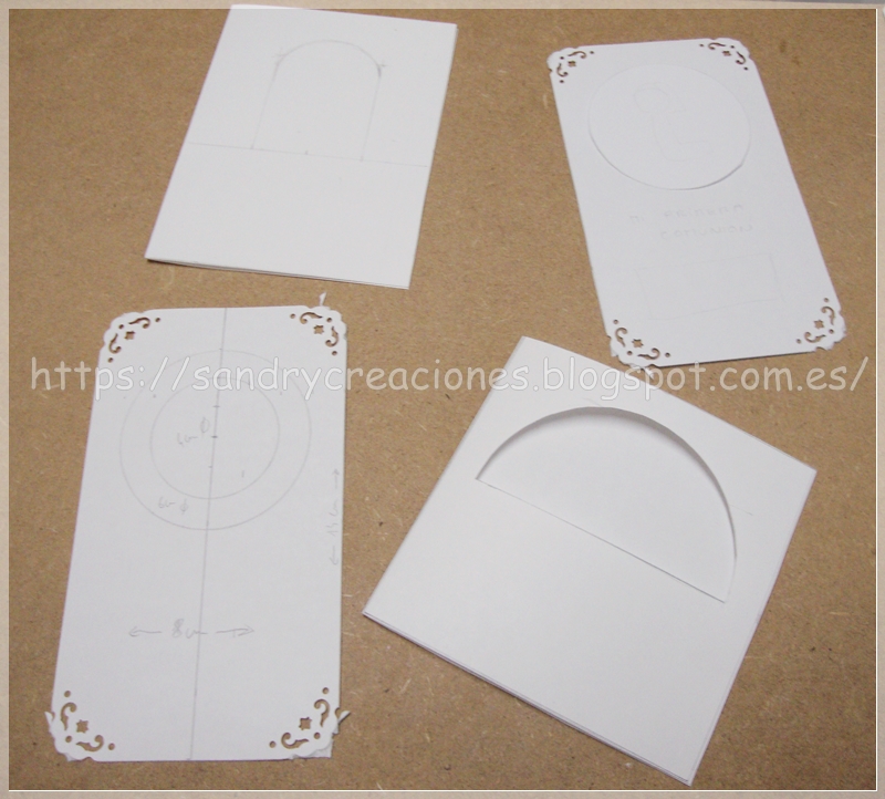 Deberemos cortar las ventanas en la mitad que cerrará el recordatorio, es decir lo que será la portada de nuestro recordatorio libro y con una medida lo suficientemente grande para que se vea por ella el diseño que tengamos en mente, por eso es muy importante pensar el diseño que queremos que se vea por la ventana antes de cortarlas.