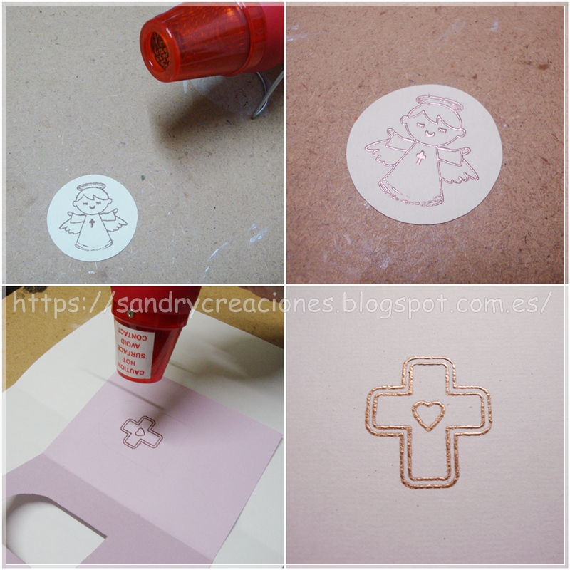 Paso 4. Con tinta transparente de secado lento, polvos de embossing de color bronce, plateado y transparente y sellos de silicona de comunión realizamos los diseños de cada recordatorio a nuestro gusto. Para realizar el embossing seguimos estos pasos: