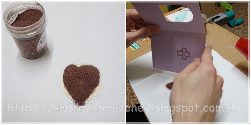 Seguidamente, ponemos un papel debajo de la cartulina que hemos marcado y cubrimos la zona de la cartulina marcada con el sello con el polvo de embossing del color escogido, podemos echarle mucho ya que tenemos que cubrir bien todo el dibujo y solo se quedará pegado el polvo que esté en contacto con la tinta que hemos puesto antes. Una vez todo cubierto, quitaremos el polvo sobrante de la cartulina dándole unos ligeros golpes y recogeremos todo el sobrante de polvos de embossing usando el papel que habíamos puesto debajo y devolviéndolos al frasco de donde los habíamos sacado.