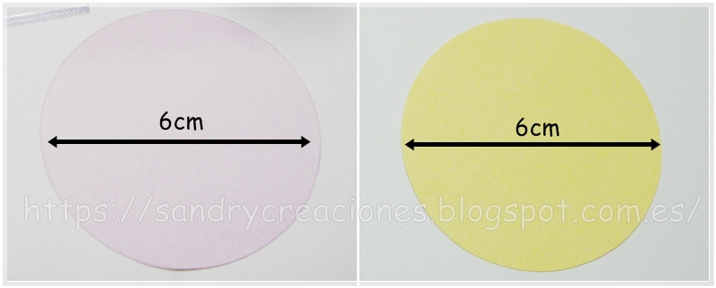 Paso 3. Cortamos varios círculos para los recordatorios simples. Cortaremos un par de círculos de 6 cm de diámetro uno en color rosa claro y otro en color amarillo y luego un circulo mas pequeño de 4 cm de diámetro en color amarillo claro.