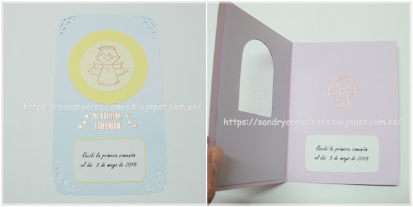 Deberemos cortar las ventanas en la mitad que cerrará el recordatorio, es decir lo que será la portada de nuestro recordatorio libro y con una medida lo suficientemente grande para que se vea por ella el diseño que tengamos en mente, por eso es muy importante pensar el diseño que queremos que se vea por la ventana antes de cortarlas.