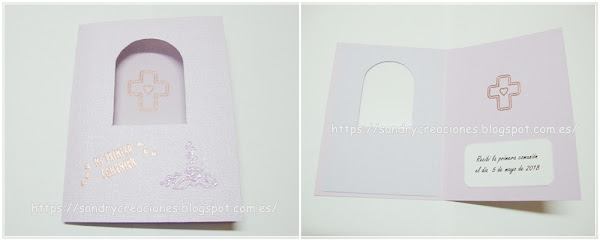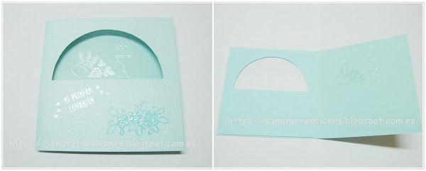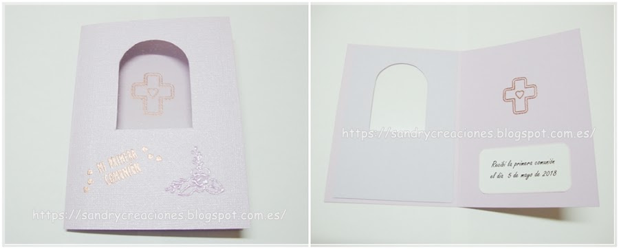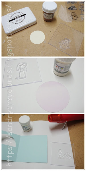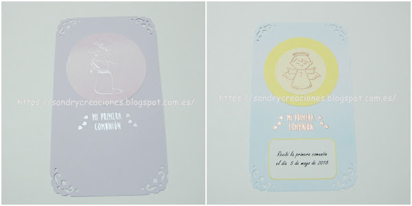 Paso 5. Tras completar todos los diseños con la técnica del embossing terminaremos los recordatorios uniendo las diferentes partes con cinta adhesiva de doble cara y usando las láminas de acetato para poner el "cristal" en las ventanas.