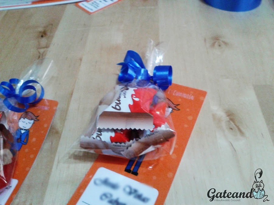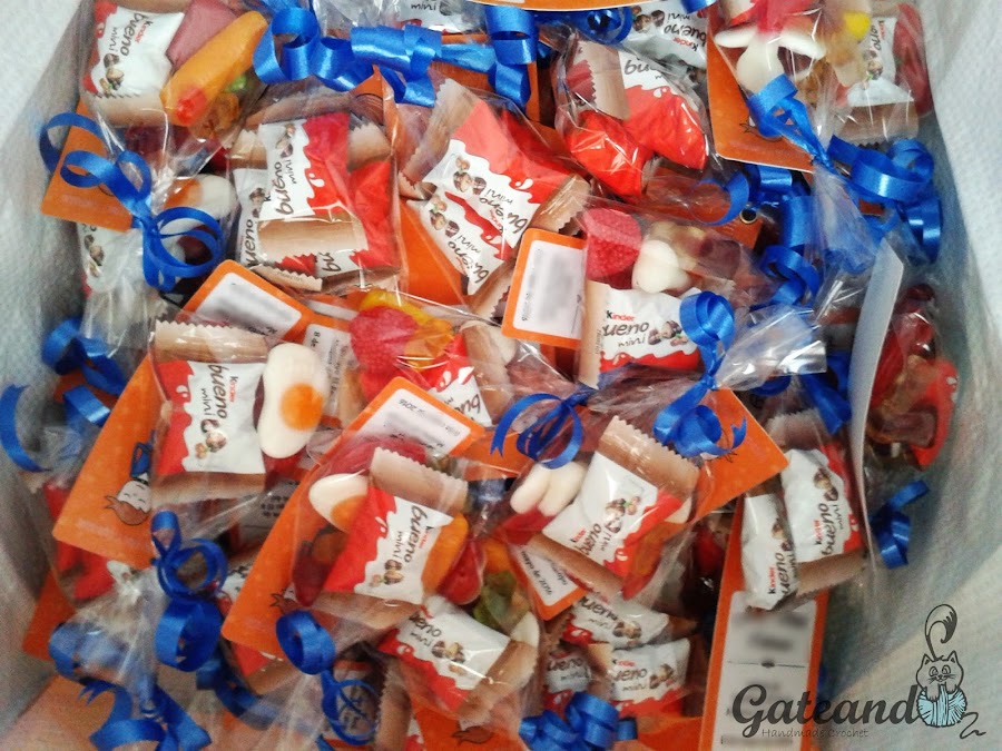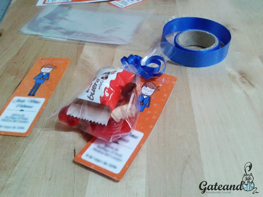 Y por último atamos la bolsita con chucherías, caramelos, bombones o lo que prefiráis, con cinta de regalo.