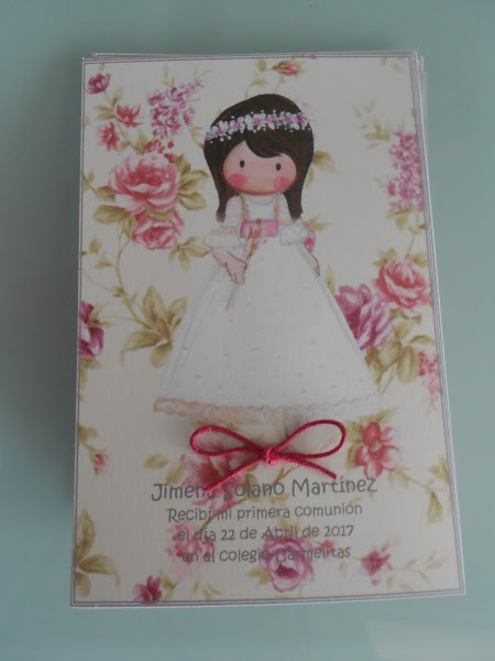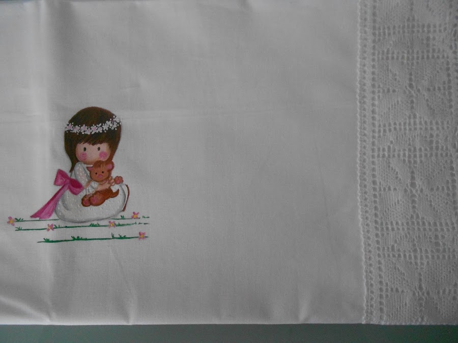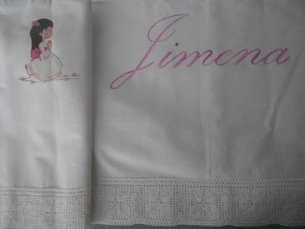 Este año ha sido muy productivo en primeras comuniones. Han comulgado mi hija, todas sus amigas, mi sobrino y los hijos de varios amigos. Así que he estado varios meses pintando sábanas y recordatorios para regalar. La primera fué la de Jimena el 22 de Abril y estos fueron sus regalos como ya lo hiciera con su hermana el año pasado.