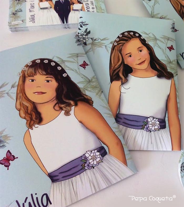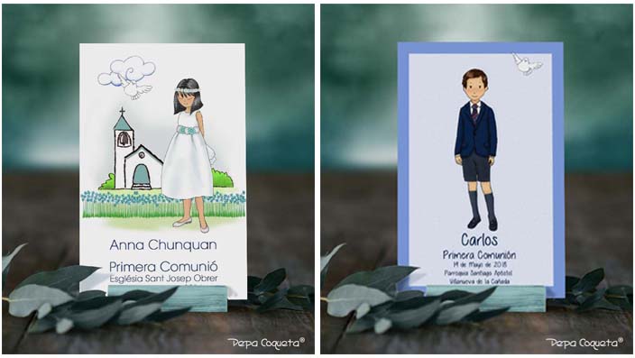 Si quieres un fondo diferente, con la capilla, iglesia o edificio donde lo vas a celebrar, nos envías una foto, lo dibujamos y lo adaptamos al formato que corresponda. Lo mismo que si quieres que dibujemos tu vestido o traje con todos los detalles. O si te hace mucha ilusión y quieres que añadamos elementos que son importantes para vosotros.