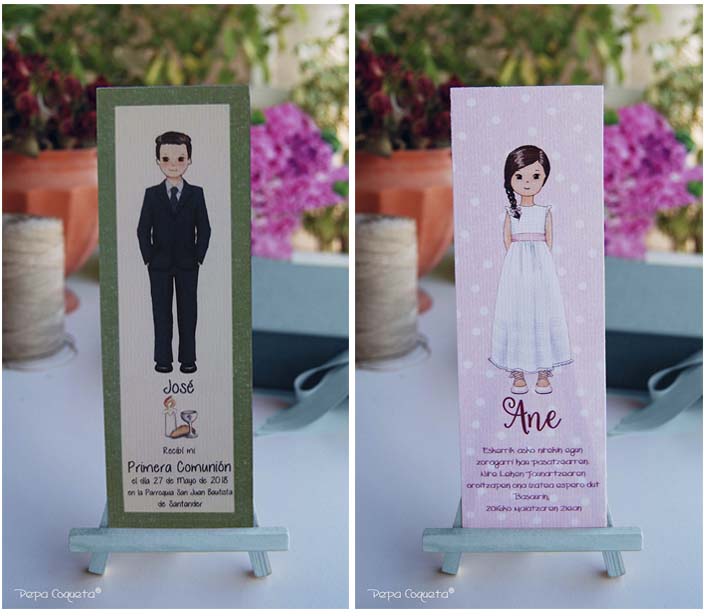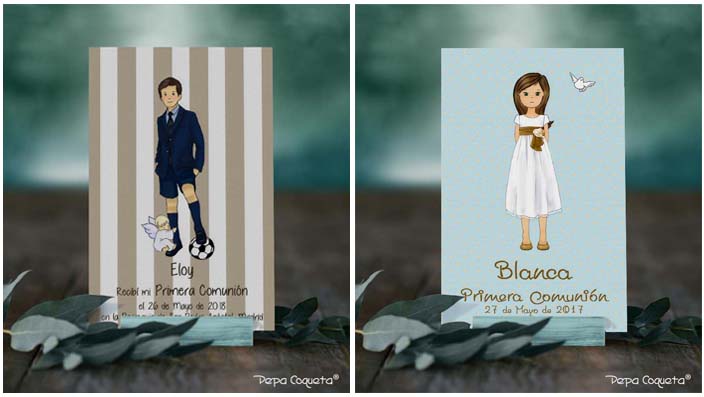 Pueden ser como tú quieras, no hay límite. Escoges un modelo del catálogo, indicas si hay que hacer alguna modificación, escoges el fondo, si quieres algún elemento (palomita, ángel...) los tonos, el tipo de letra y tachánnnnn, ahí tienes tu recordatorio personalizado.