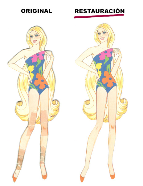 Os he puesto dos ejemplos de cómo estaban las muñecas y cómo las he arreglado para que veáis el desastre y eso que yo, muy inteligentemente, ya las había pegado en una cartulina gruesa para que no se me doblaran cuando era peque.