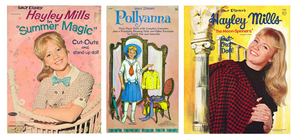 Hayley bien podría ser un poco la Marisol británica ("Un rayo de luz" de Marisol y "Pollyanna" de Hayley se estrenaron las dos en 1960, pero esto es otra historia que quizá algún día retomemos), no solo actuaba sino que también cantaba, todo un portento que Disney supo explotar a las mil maravillas comercializando las bandas sonoras de todas sus películas además de todo tipo de merchandising oficial, incluidos unos cuantos libritos de muñecas recortables.