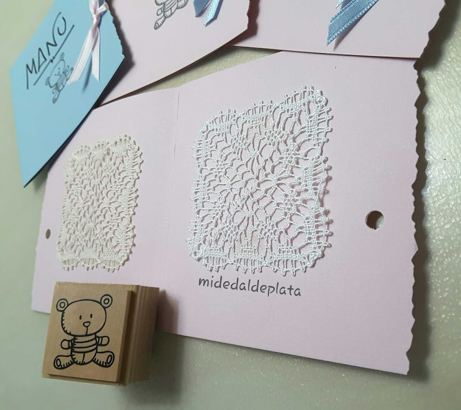 El recuerdo de Manu lo hice con hilo Fincrochet del número 50 en beige, para entregarlo en cartulina celeste, cerrada con cinta de raso en rosa.