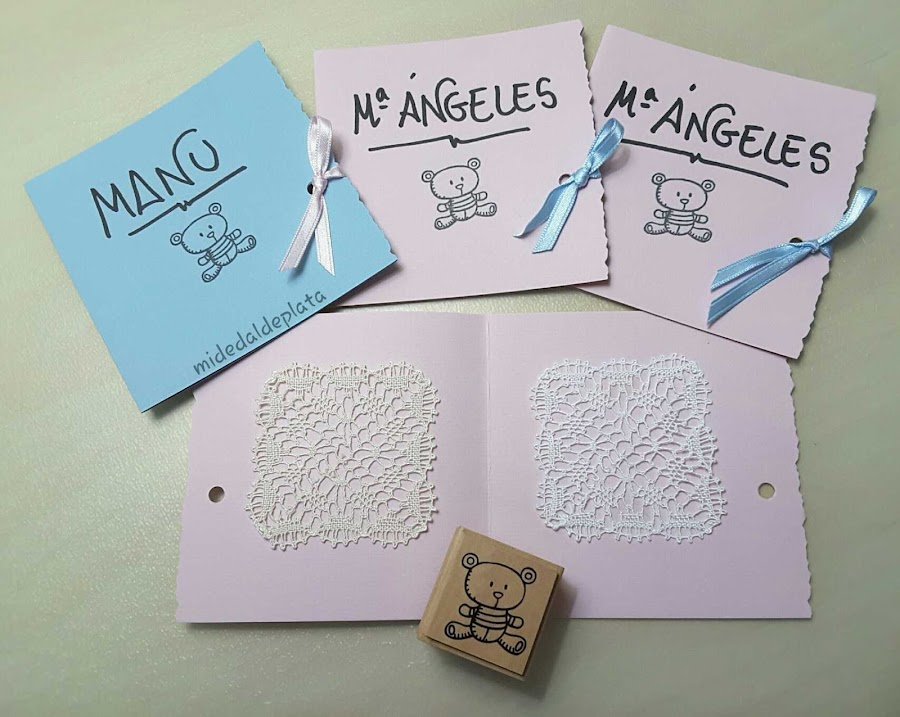 Para los pañitos de Ange llené los bolillos con hilo Fincrochet del número 50 en blanco, y con adhesivo de dos caras quedaron fijados a las cartulinas rosas con su nombre, cerradas con cinta de raso en celeste.