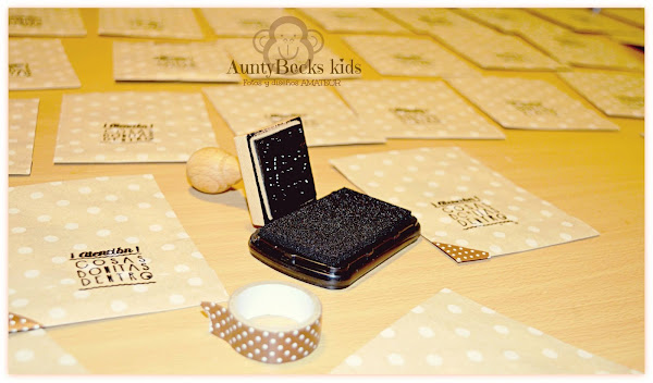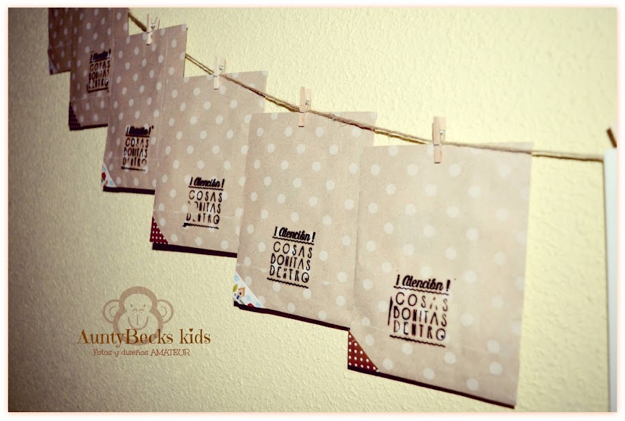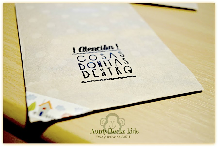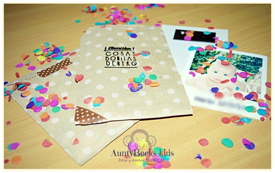 Compre unas bolsitas de papel craft con lunares blancos, un rollo de whasitape y un sello en el que ponía ¡Atención cosas bonitas dentro!Metí la foto-imán con un poco de confeti y ya está! listo para entregar a la familia y amigos :D