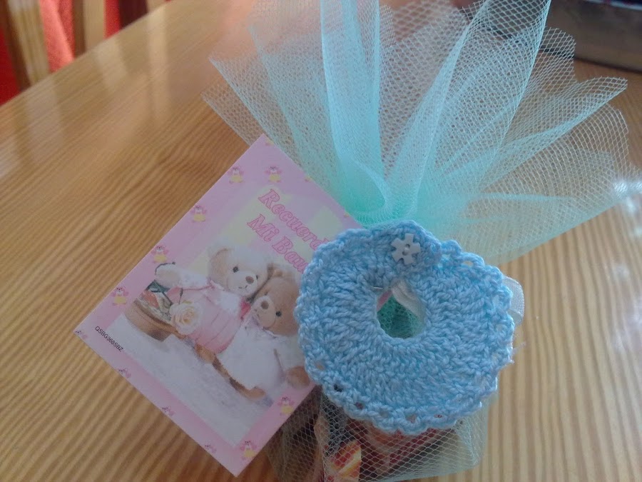 Opción C: Baberito con saquito de tul y lacito de raso. Puede ir con o sin caramelos.... El babero va unido con un imperdible.