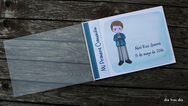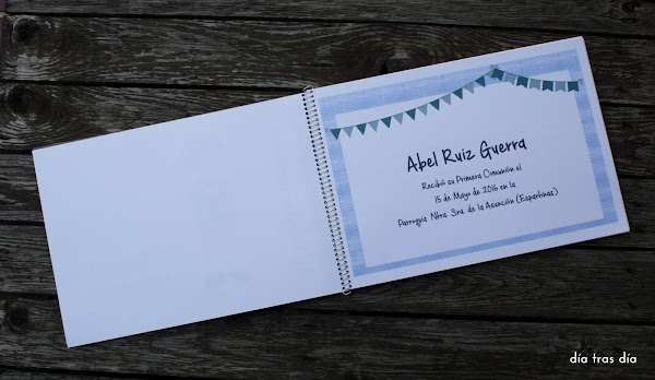 Y sin que él lo viese, le preparé su Libro de firmas haciendo juego con los recordatorios, para que todas las vivencias del día de su Primera Comunión quedaran plasmadas en sus páginas.