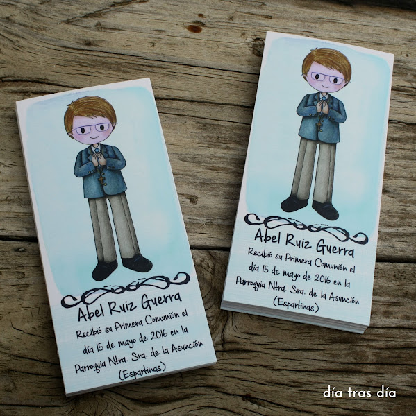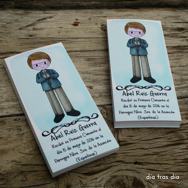 Para ambas cosas hice un dibujo personalizado de Abel, como no podía ser de otra manera, con sus características gafas. Absolutamente todos los detalles del recordatorio fueron elegidos por Abel, que se entretuvo en examinar entre los posibles fondos que yo tenía disponibles, tanto para la parte inferior como superior del recordatorio, hasta dar con el que más le gustó.