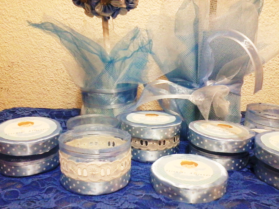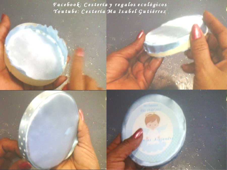Le ponemos silicón a una de las ruedas de tela y pegamos por dentro de la tapa, hacemos lo mismo con la otra rueda de tela: pegamos por la parte de afuera.... Ahora, pegamos una tira de listón decorativo alrededor de la tapa y listo ! Como yo hice estas cajitas para el bautizo de mi nieto, imprimí la imagen del angelito y la pegué arriba.