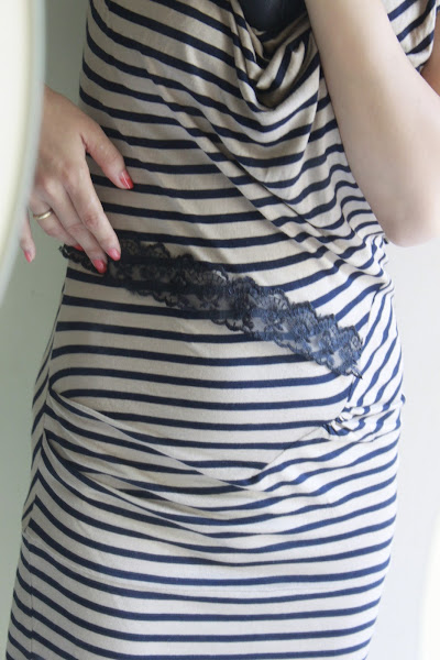 Entonces, para "salvar" el vestido que me acababa de comprar, he decidido ponerlo un trozo de tela de encaje por encima. Es rápido y queda bien.