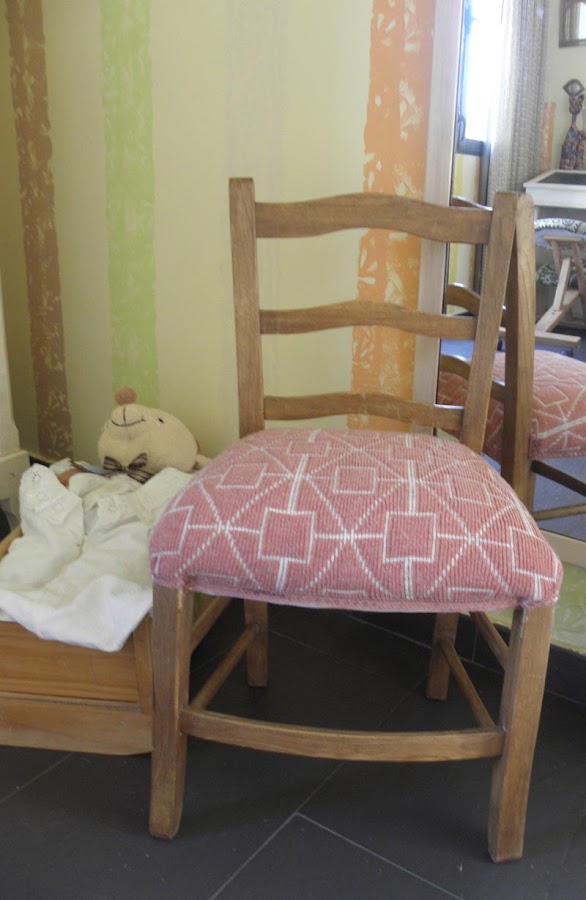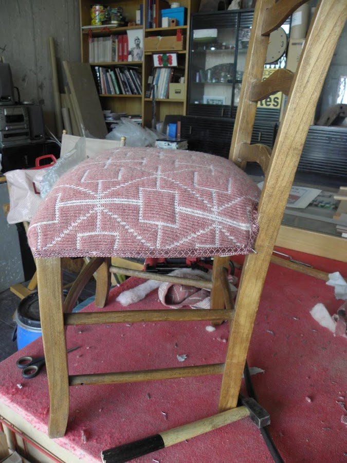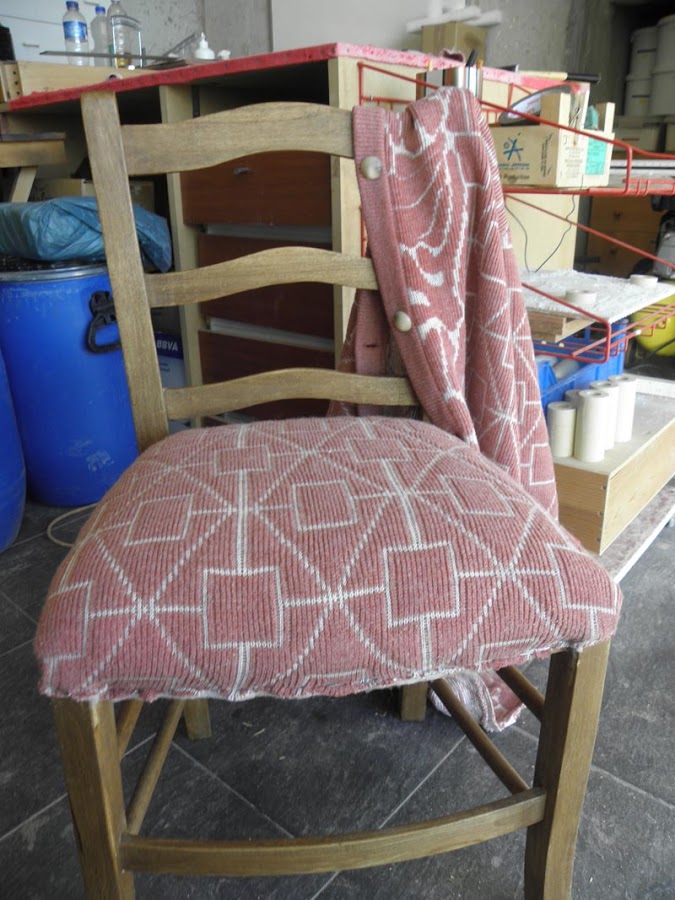 Y a tapizar, como es habitual reciclando. En esta ocasión la silla pedía a gritos una tela acogedora y utilicé una vieja chaqueta de punto de mi madre que ya no usaba.